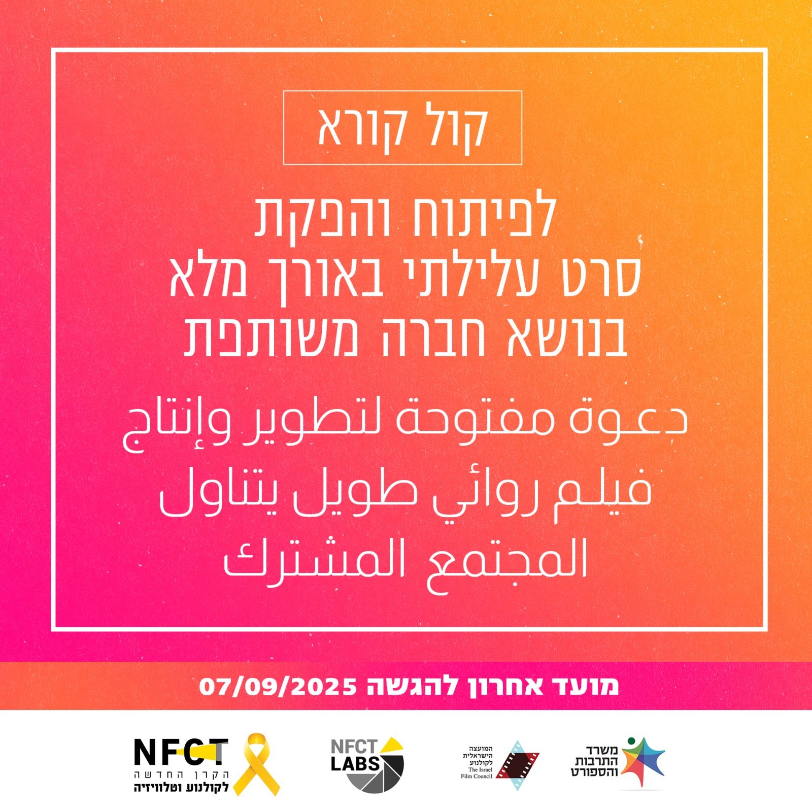 لأول مرة - دعوة مفتوحة لتطوير وإنتاج فيلم روائي طويل - في جميع الجانرات يتناول موضوع المجتمع المشترك في إسرائيل 2026. حتى 6 سينمائيات وسينمائيين سيشاركوا في المرحلة الأولى - مرحلة تحرير سيناريو مهنية حتى 3 مشاريع ستنتقل إلى المرحلة القادمة - مرحلة تطوير تشمل منحة تطوير وتصوير المواد البصرية المشاريع التي ستجتاز مرحلة التطوير وتقدم ملف إنتاج كامل ستتسابق على منحة إنتاج بقيمة 2 مليون شيكل، لمشروع تبلغ ميزانيته 3 مليون شيكل على الأقل.