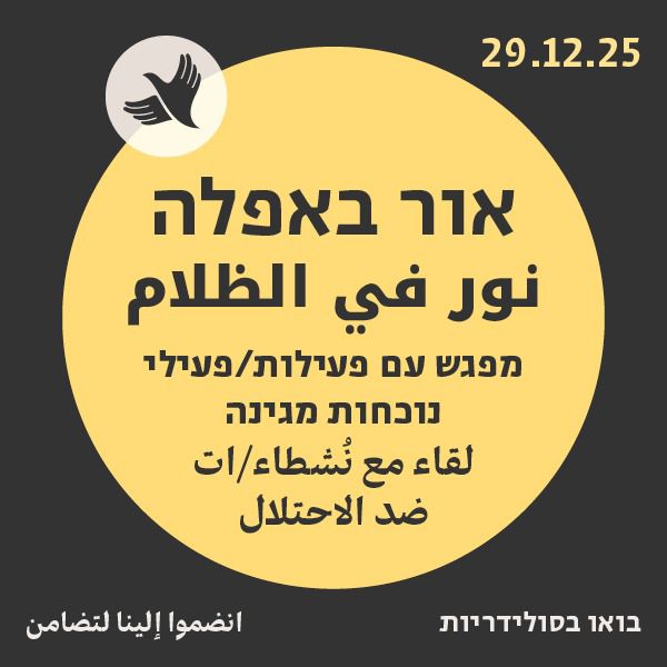 בואו לשאול, על כוס בירה, את כל מה שרציתם לדעת: מה זה נוכחות מגינה? איך אפשר להצטרף? כמה זה מסוכן? מה זה דורש? איך מגיעים לשם? כמה זה אפקטיבי? אנחנו לוקחים חלק באירוע יחד עם פעילים ופעילות מקבוצות שטח שונות: מסתכלים לכיבוש בעיניים, צפון הבקעה, מסאפר יטא, בני אברהם, עומדים ביחד ועוד. באירוע גם יריד תוצרת חקלאית מקהילות פלסטיניות, וגם מוזיקה. פרטים מדויקים ישלחו לנרשמים. להרשמה >>> https://bit.ly/4oEg5d9