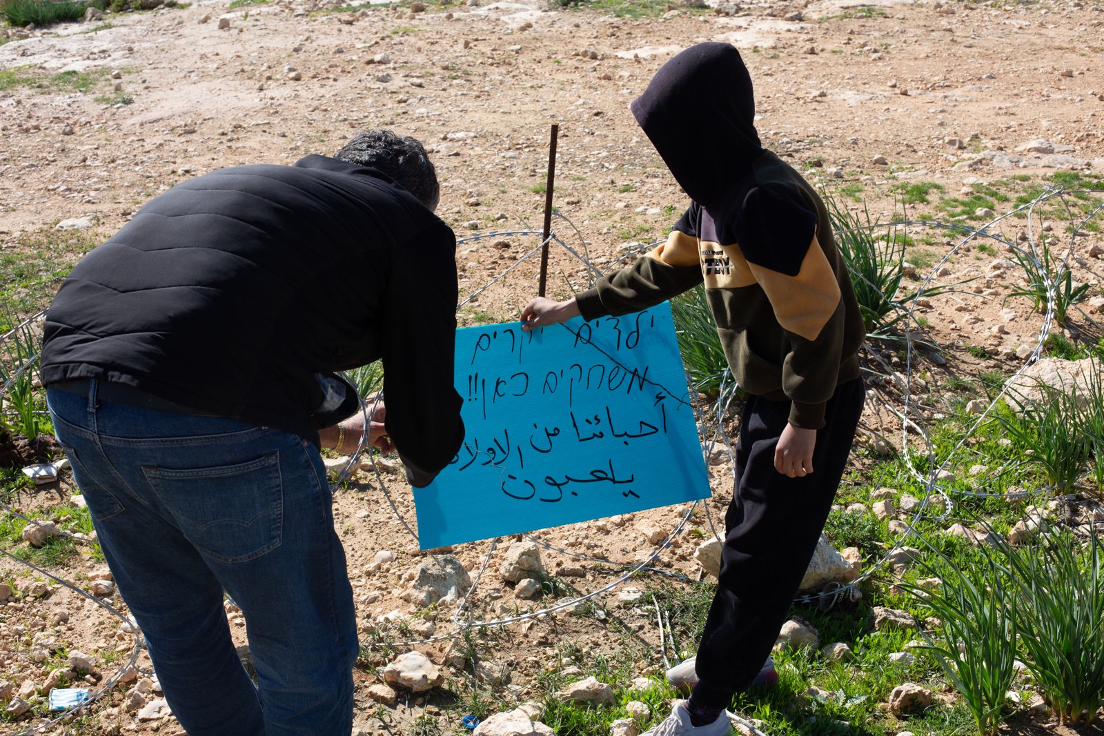 משם המשכנו למופקארה. פגשנו את נאסר, הכנו יחד שלטים ותלינו אותם על גדר התיל שהקהילה הקימה כדי להגן על עצמה מפני פלישות חוזרות. פעולה פשוטה של נוכחות, שמבקשת לייצר מעט ביטחון בתוך מציאות מתוחה ומאיימת.
