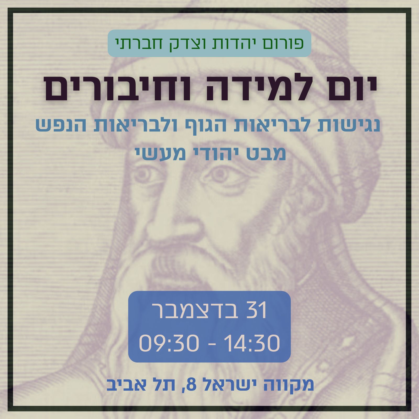 בשנה הקרובה הנושא השנתי הוא "בריאות, יהדות וצדק חברתי". במסגרת זו אנחנו מזמינים אתכם ליום למידה וחיבורים בנושא "נגישות לבריאות הגוף והנפש - מבט יהודי מעשי". היום מיועד לארגונים, למומחים ולקהילות, ומטרתו ללמוד את הנושא ממגוון נקודות מבט ולבנות חיבורים ושותפויות להמשך הפעילות. נבקש לבחון את המצב היום ולהעלות הצעות לקידום החברה הישראלית למצב ראוי יותר, תוך כדי בדיקת המקום של שיח יהודי בשינוי המצב.
